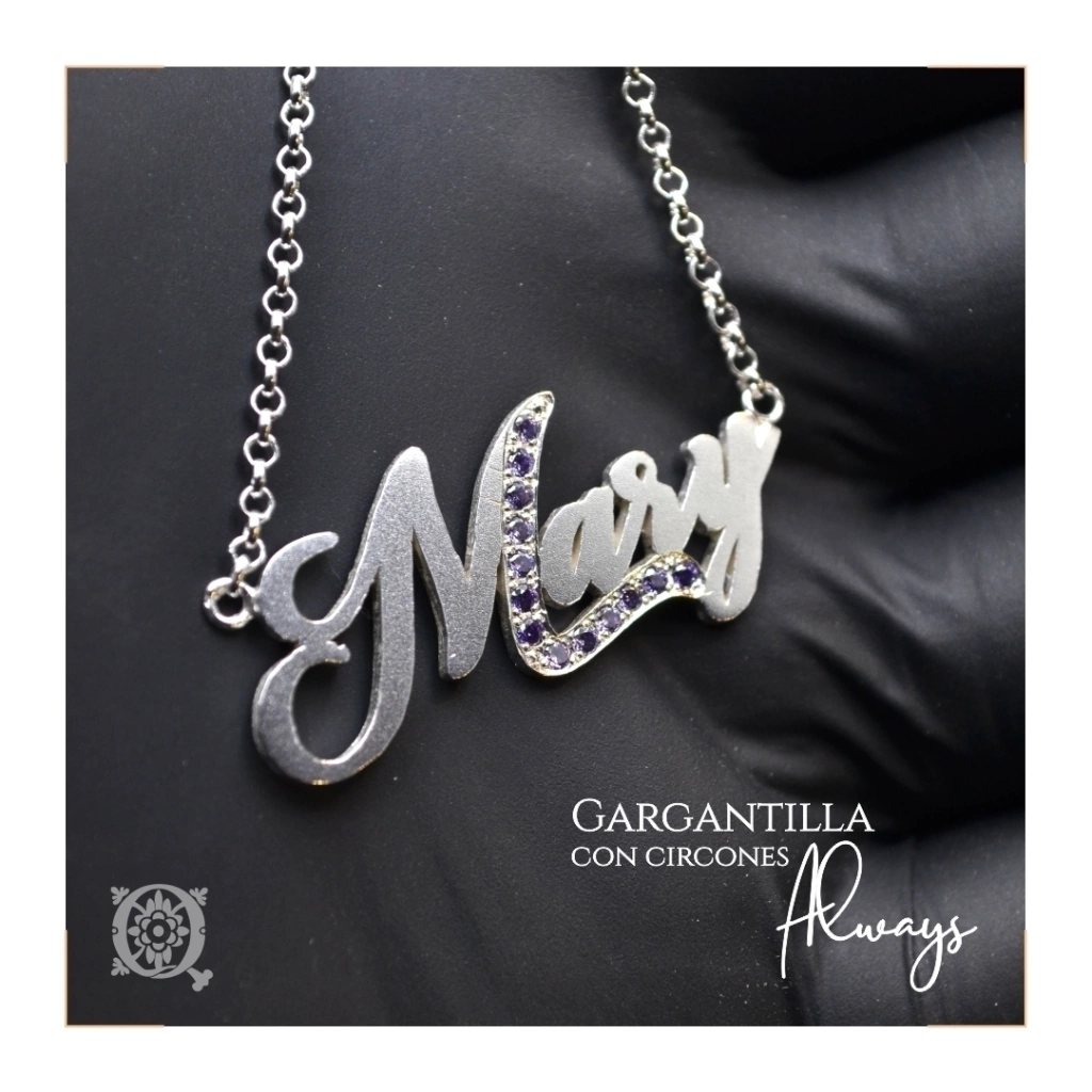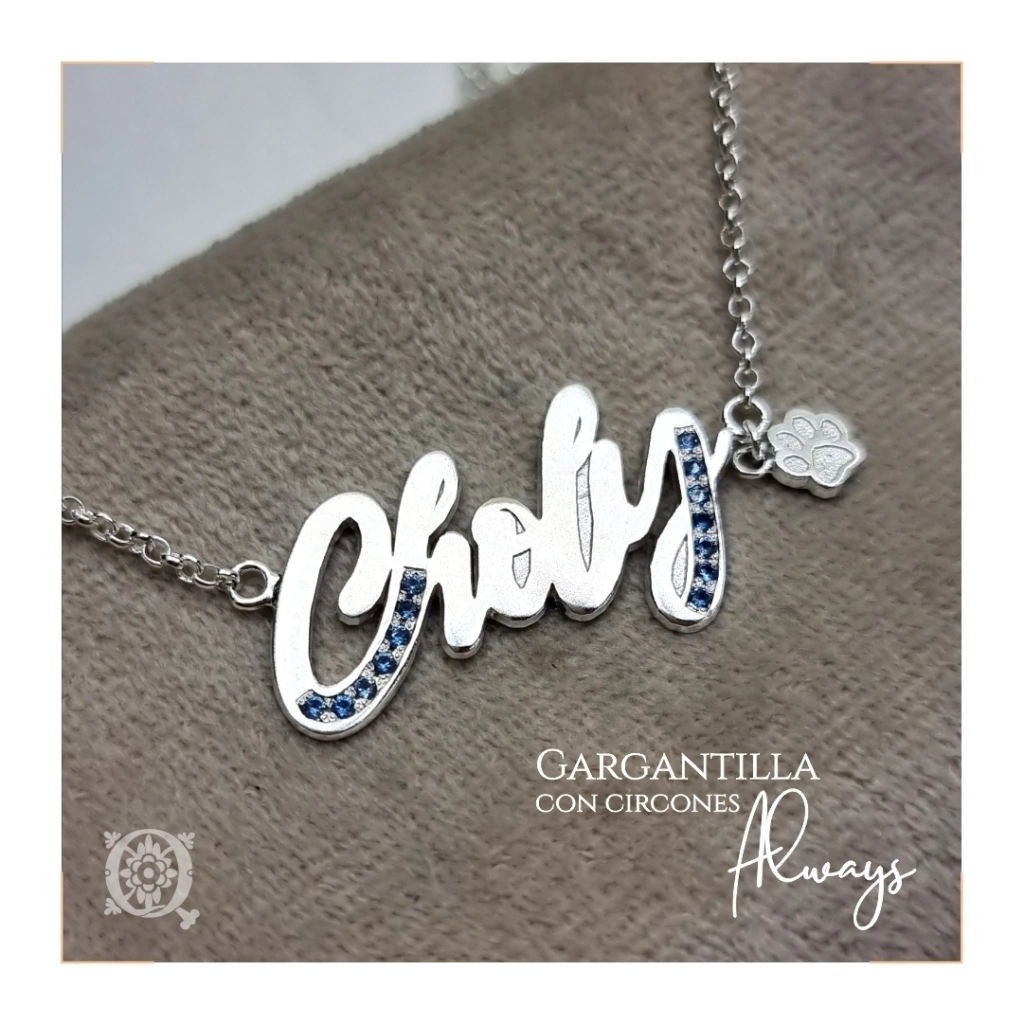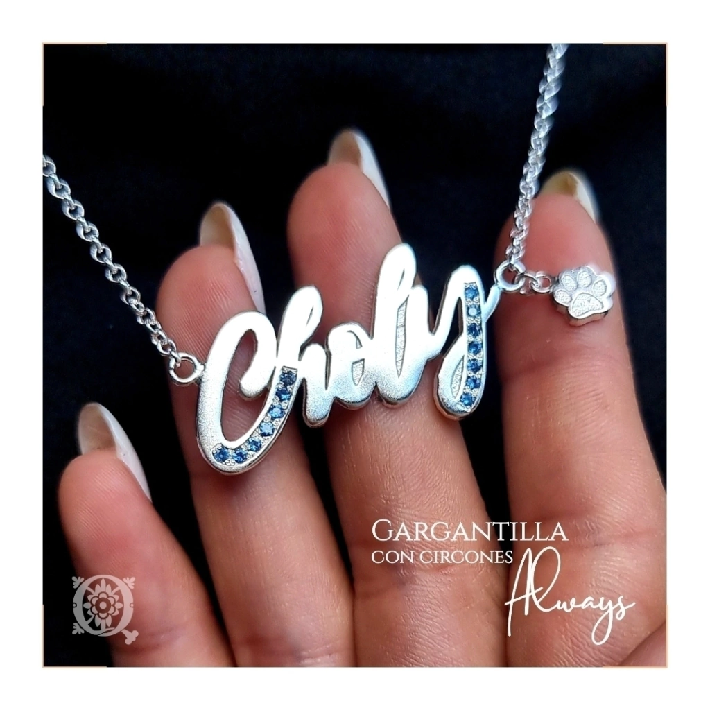 Esta es la gargantilla Always, pero la tuya se puede llamar como prefieras, porque podés personalizarla con esa palabra que te resuena e identifica. Con circones color a elección, en Plata 925. Realizado a mano con cadena de plata 925 de 40, 45 o 50 cm de largo.